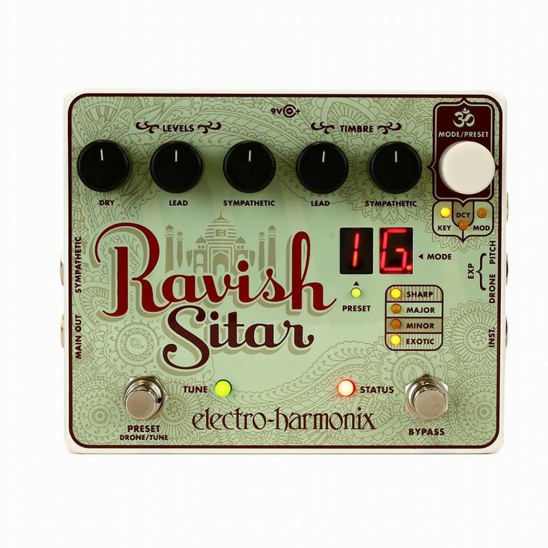 シタールのように多くの倍音を含み柔軟性のある楽器はそうはありません。Electro-Harmonix は最新テクノロジーによりシタールサウンドをペダルサイズに凝縮しました。和音にも対応し、共鳴するドローンは演奏にダイナミックに反応します。ドローンとはインドの伝統音楽には欠かせない、単音で鳴る長い音です。主音が減衰する時間に合わせた弦の共鳴に対し、共鳴弦のスケールをカスタマイズできます。