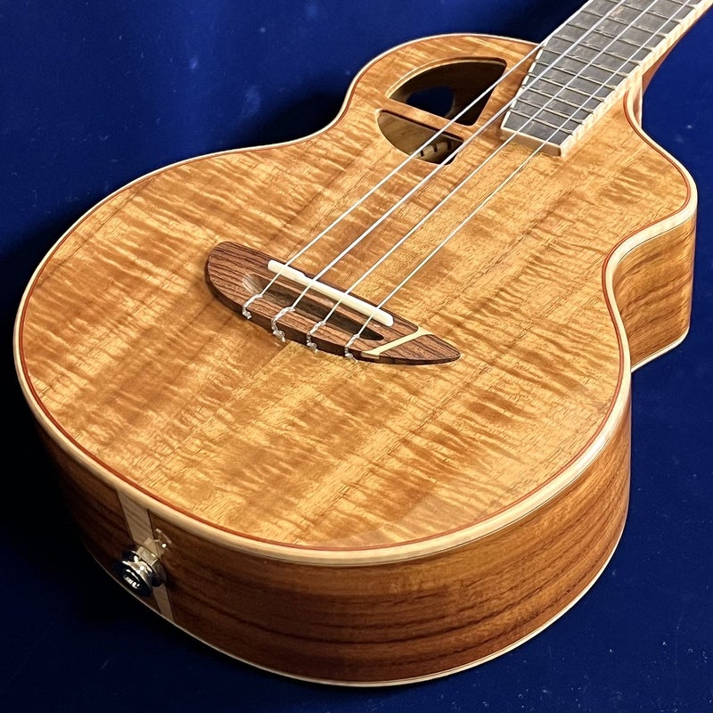 本器はオールコアボディーを採用したコンサートウクレレ、Le Light Koa。ギターのLEシリーズ同様、トップ低音側上部に配置された独自のサウンドホールとサイド側にマウントされたサウンドポートはパフォーマンス中に高い感度を実現。演奏者自身が聞くサウンドと聴衆へ届けるサウンドをセパレートしモニタリングすることを考えている所が特徴です。