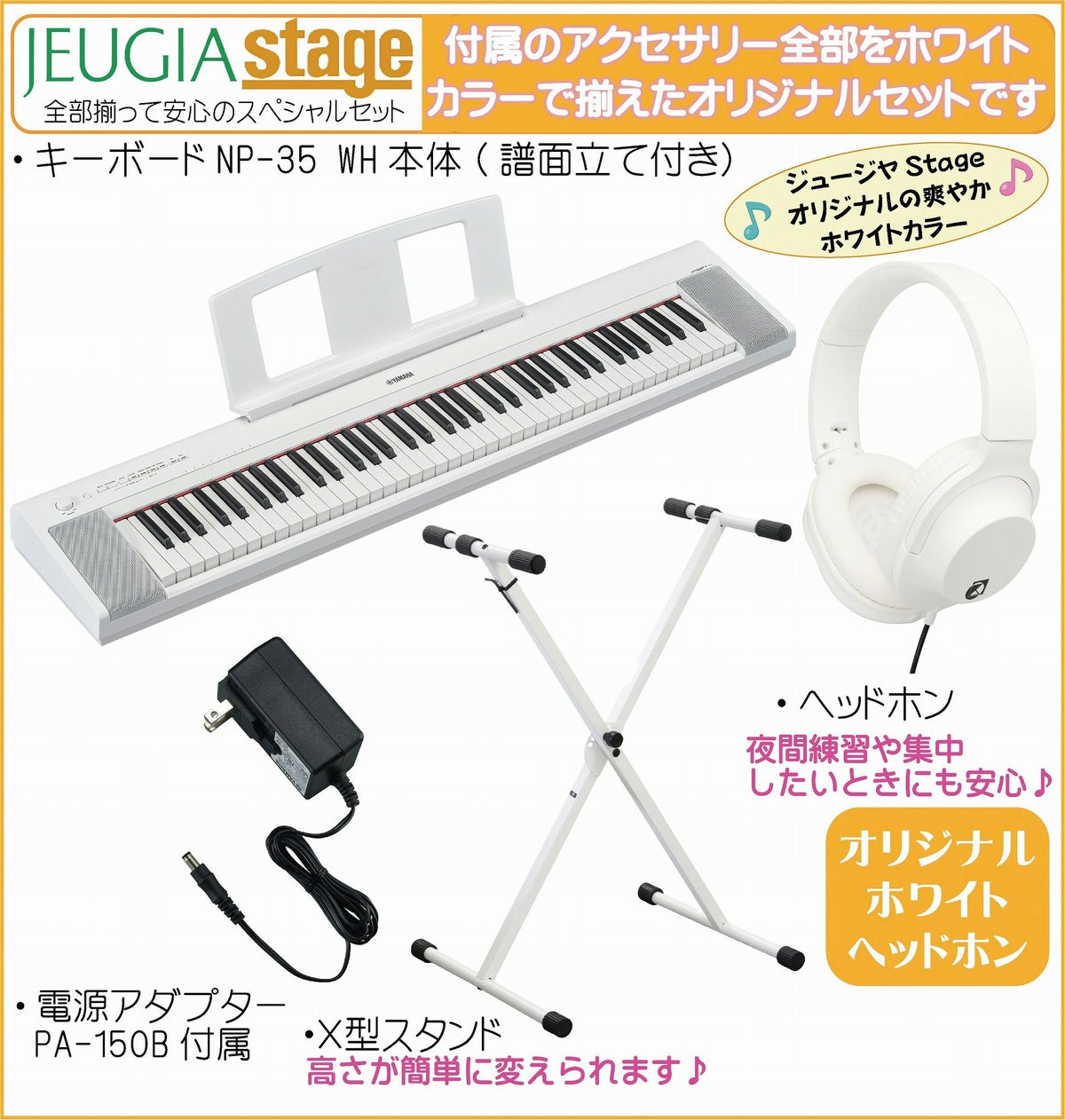 他の画像を見る 軽量コンパクトで美しいピアノ音と自然なタッチの鍵盤を搭載したキーボードにお色合わせした白いアクセサリーをセットにしてご用意しました YAMAHA piaggero NP-15WH 【スタンド(白)・イス(白)・ヘッドホン(白)付】 ヤマハ ピアジェーロ キーボード ホワイト 61鍵盤※こちらの商品はお取り寄せとなります。メーカー在庫確認後ご連絡します。 販売価格 ¥ 35,200 税込 カートに入れる お気に入りに登録する