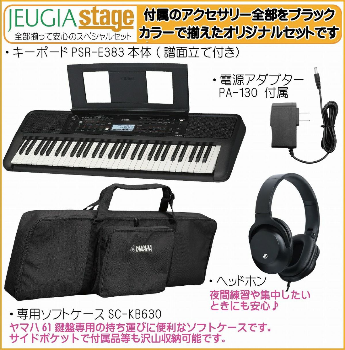 他の画像を見る ♪音の強弱を表現できるタッチレスポンス、650種類の音色、充実したレッスン機能搭載の表現力豊かな演奏を楽しめるスタンダードモデル♪ YAMAHA PSR-E383【専用ソフトケースSC-KB630・ヘッドホン(黒) 付】Portable Keyboard ヤマハ ポータブルキーボード 61鍵盤 ブラック【Stage-Keyboard】黒※この商品はお取り寄せ対応品となります。在庫確認後ご連絡いたします。 販売価格 ¥ 33,550 税込 カートに入れる お気に入りに登録する