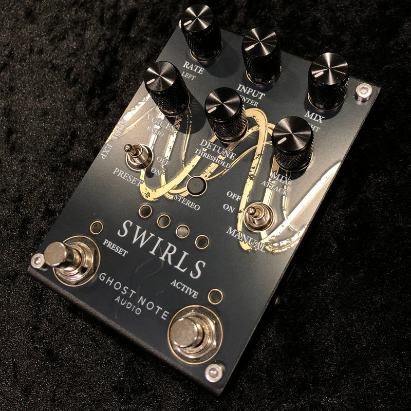 Swirlsは、Ghost Note AudioのDaedalusシリーズに属するデジタル・エフェクトペダルです。フェイスプレート交換とファームウェア書き換えにより、シリーズ内の別エフェクトへ再プログラムできます。\n\nフルMIDIコントロール、エクスプレッション入力、USB給電(または9V DC)に対応。Web Editorからリアルタイム制御や追加パラメーター設定も行えます。\n\nファームウェア更新時は、電源を切った状態で中央の黒いボタンを押しながらUSB-Cを接続し、認識されたUSBストレージへ `.uf2` ファイルをコピーしてください。