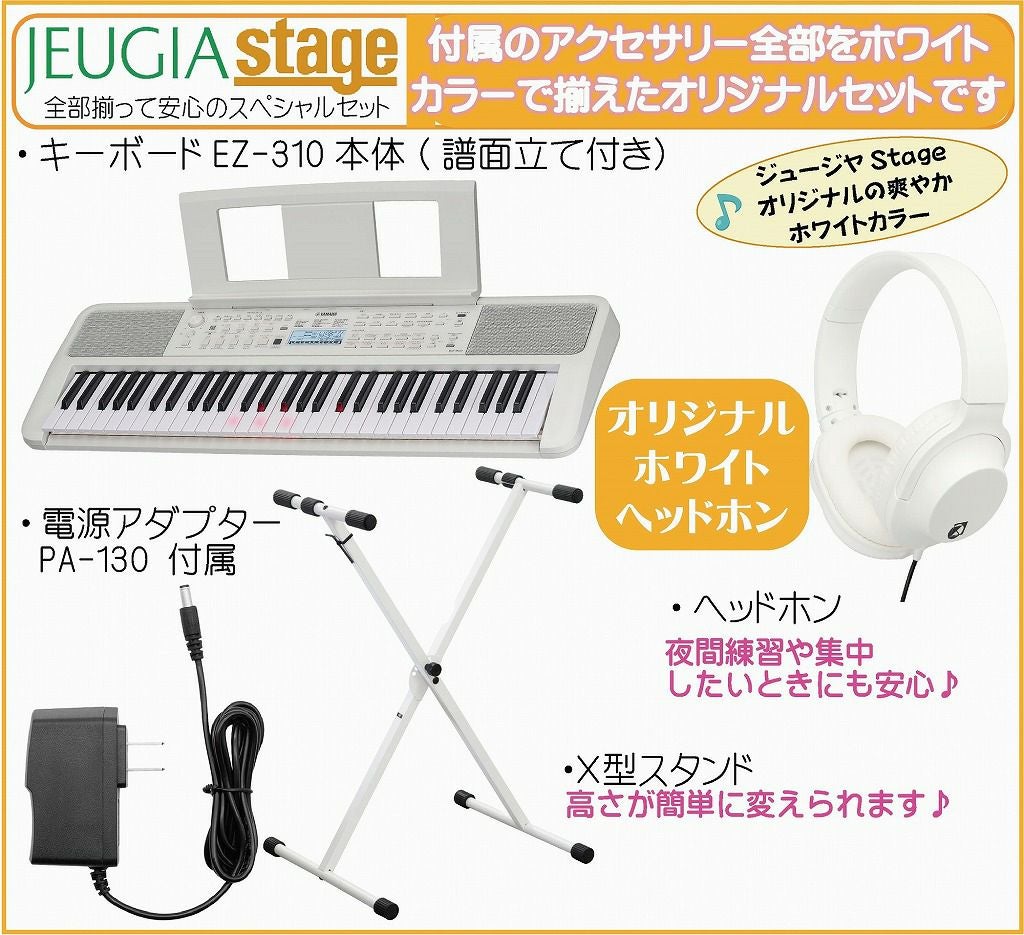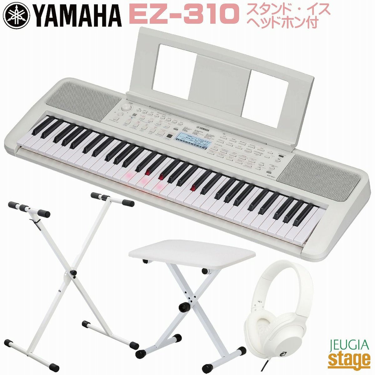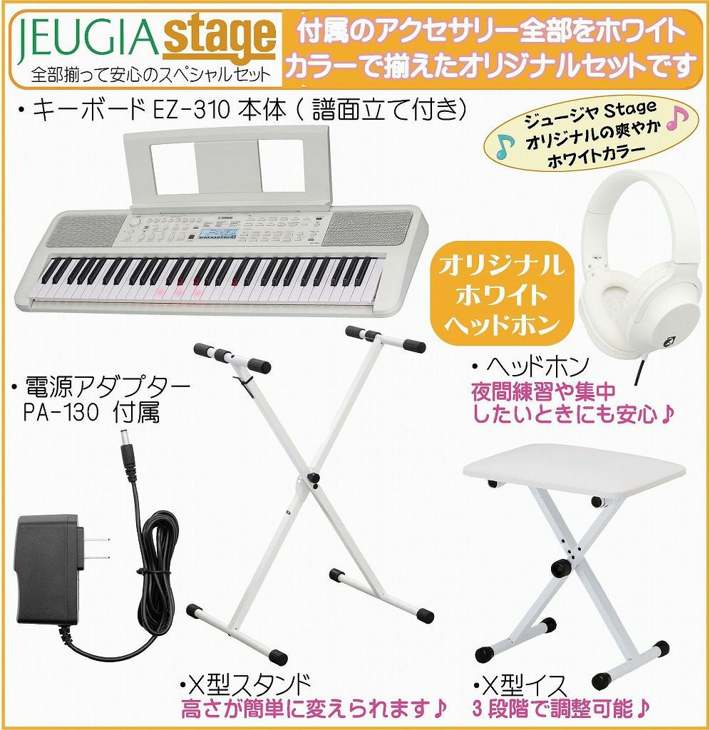 他の画像を見る ♪初めてでも楽しく弾ける、光る鍵盤モデル。アニメ曲やポップスなどの人気曲を搭載し、豊富なレッスン機能で上達をサポートします♪ YAMAHA EZ-310 【スタンド(白)・イス(白)・ヘッドホン(白) 付】Portable Keyboard ヤマハ ポータブルキーボード 61鍵盤 光る鍵盤 ホワイト 【Stage-Keyboard SET】※この商品はお取り寄せ対応品となります。在庫確認後ご連絡いたします。 販売価格 ¥ 39,600 税込 カートに入れる お気に入りに登録する