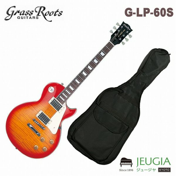 GrassRoots(グラスルーツ)G-LP-60S CHS エレキギター。 BODY:(Top) Flame Maple Veneer(thru color) (Back) Mahogany NECK:Mahogany / Rosewood, 22Frets SCALE:628mm JOINT:Set-neck PICKUPS:GH-1G×2 CONTROL:Neck&Bridge Volume,Neck&Bridge Tone,PU Selector BRIDGE:Tune Matic / Stop Tailpiece COLOR:Cherry Sunburst(チェリーサンバースト) ソフトケース付き