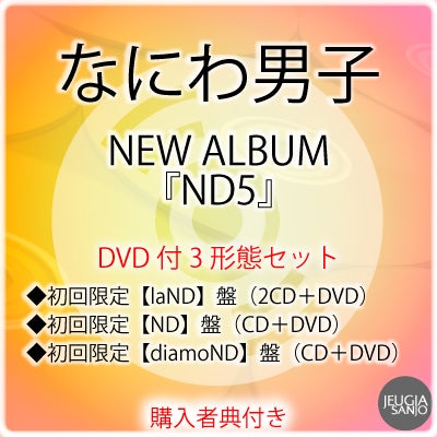 他の画像を見る 「Naniwa Danshi」の5乗をタイトルに掲げた、煌めき溢れるニューアルバム。たくさんの愛と幸せを届ける5周年イヤーのセレブレーション開幕と共にお贈りします。 【予約】2026.6.17発売なにわ男子 NEW ALBUM『ND5』DVD付3形態セット<初回限定【laND】盤(2CD+DVD)+初回限定【ND】盤(CD+DVD)+初回限定【diamoND】盤(CD+DVD)>※購入者特典3種+初回限定盤3種 同時購入特典付き![三条本店] 販売価格 ¥ 12,620 税込 販売期間 〜 2026/06/15 23:59 詳細を見る お気に入りに登録する