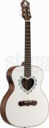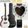 ハート型サウンドホールのオーケストラ・モデルのCAF-90Hは、マザー・オブ・パールのダイヤモンド・インレイが輝く特徴的なヘッドストックを持ったマホガニー・ネックにローズウッド・フィンガーボードを採用した20フレット仕様の14フレット・ジョイントとなっています。