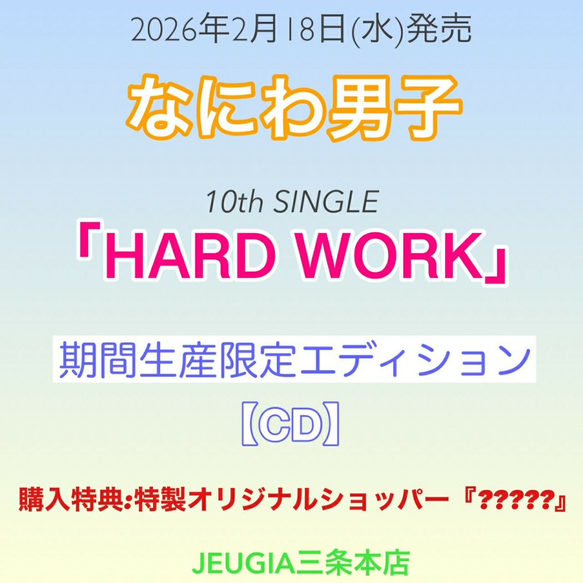 他の画像を見る なにわ男子 10枚目となるシングル「HARD WORK」は、メンバーの大西流星 主演ドラマ『東海テレビ×WOWOW 共同製作連続ドラマ 横浜ネイバーズ Season1』の主題歌です。 【予約】2026.2.18発売なにわ男子 ニューシングル『HARD WORK』期間生産限定エディション(CD ONLY)※購入者特典:特製オリジナルショッパー『?????』付き![三条本店] 販売価格 ¥ 728 税込 販売期間 〜 2026/02/16 23:59 詳細を見る お気に入りに登録する