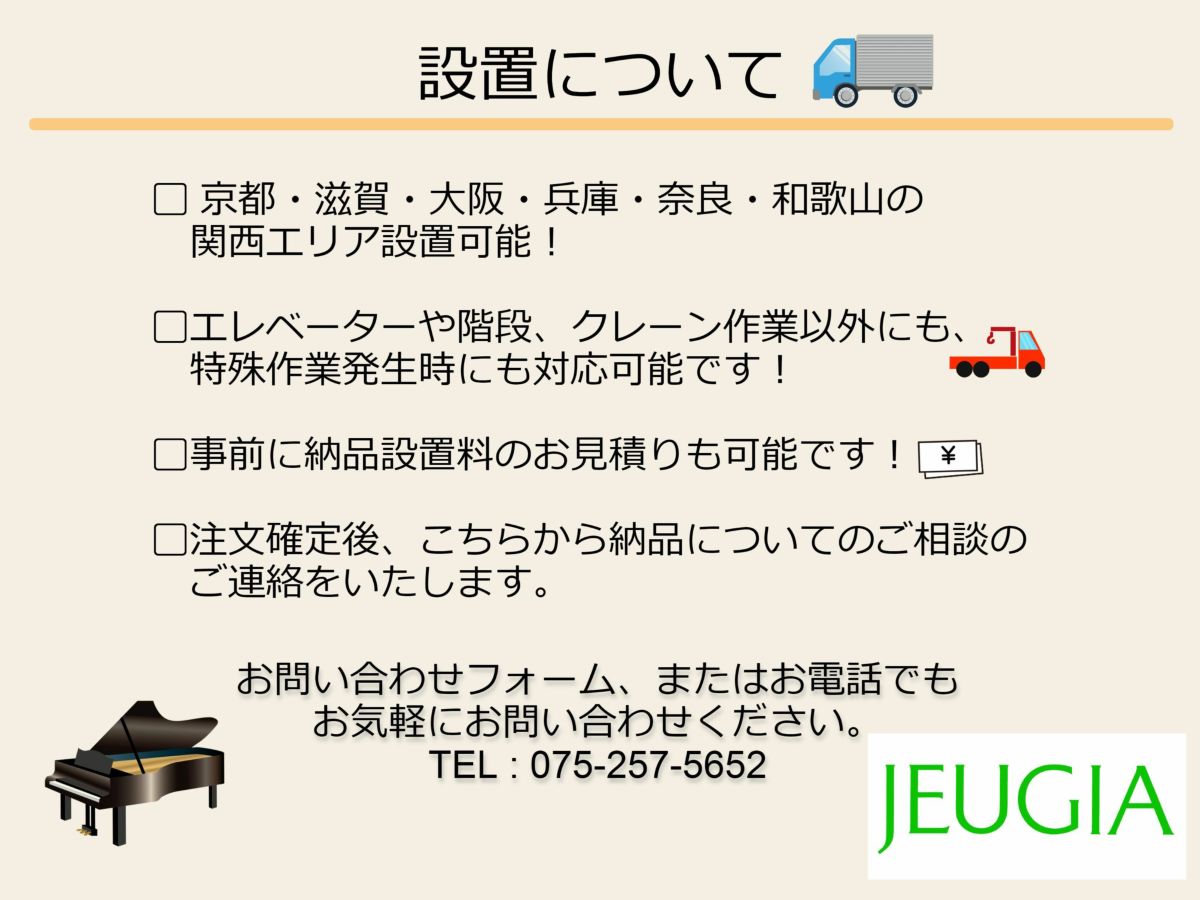 他の画像を見る 関西エリア限定配送設置可能!【京都:宇治大久保店展示 】 【USED】YAMAHAグランドピアノ消音機能付きC2-SN お電話でもお気軽にお問い合わせください。 075-257-5652 販売価格 ¥ 1,540,000 税込 在庫切れ コンパクトな消音機能付きグランドピアノです! 詳細を見る お気に入りに登録する